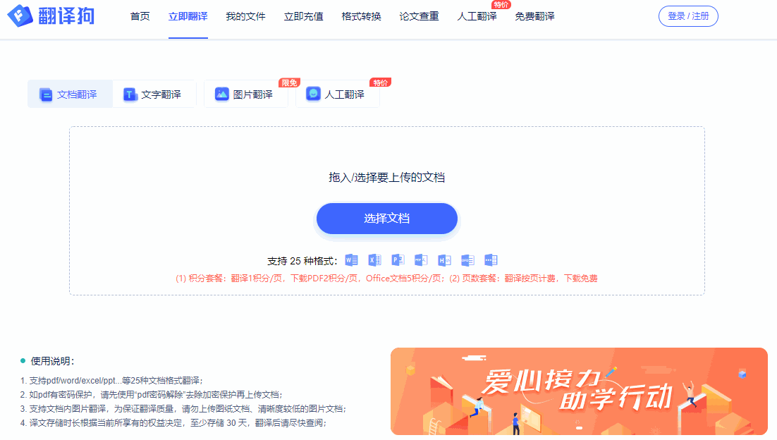这个在线翻译网站提供了文档翻译、文字翻译、图片翻译和人工翻译的需求。支持翻译25种格式的文档,平时我们接触到的文档,基本上它都能处理,可以翻译上百种语言。