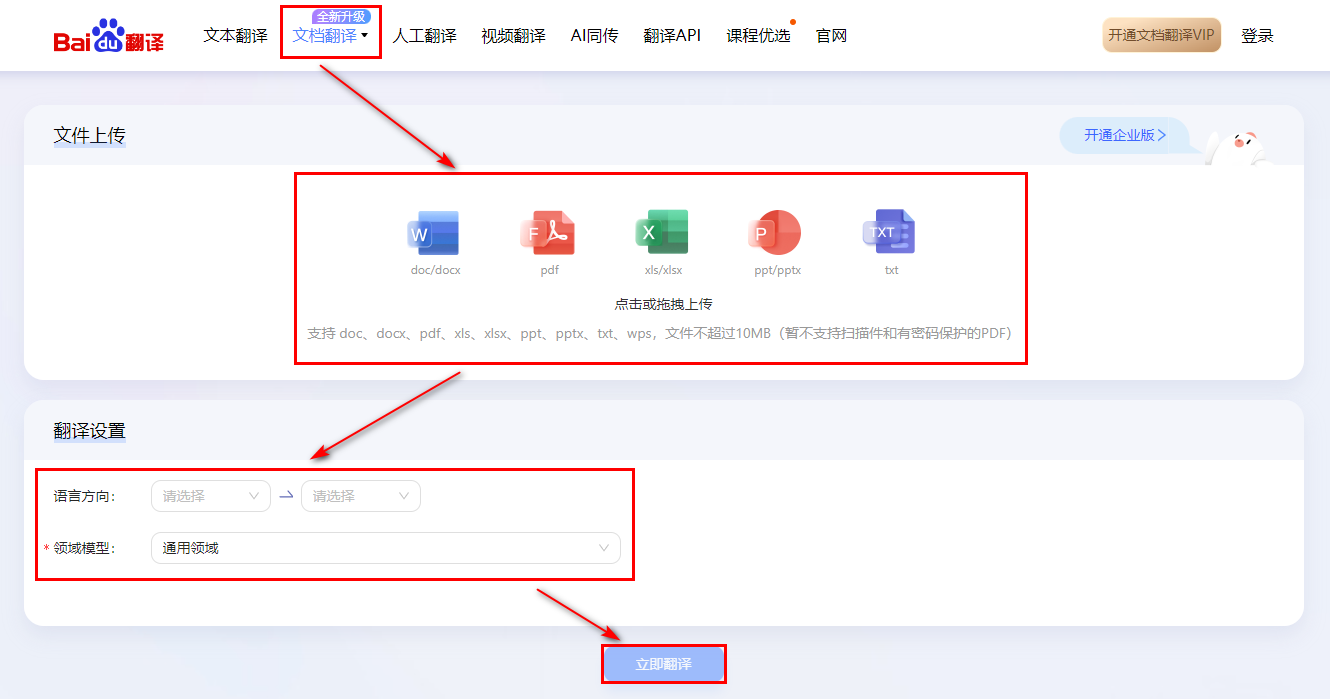 操作步骤:在浏览器中打开该网站,选择“文档翻译”功能,点击或拖拽文件上传,在“翻译设置”中设置语言方向和领域模型,点击“立即翻译”按钮进行翻译。