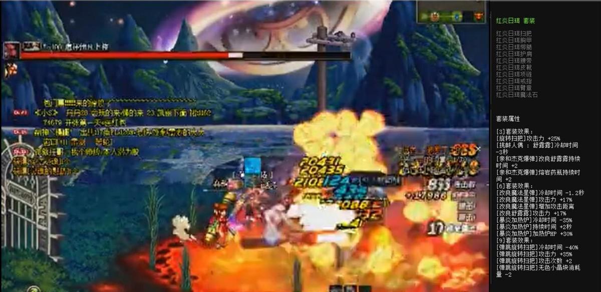 主要加成技能为暴炎加热炉,红炎日珥九件套只加成了弹跳旋转扫把,所以只穿着6件即可达到效果。几秒一个的大火炉狂轰乱炸,一个技能即可清屏,数不清的大火球从炉子中喷涌而出,伤害不俗的同时视觉效果也拉满。