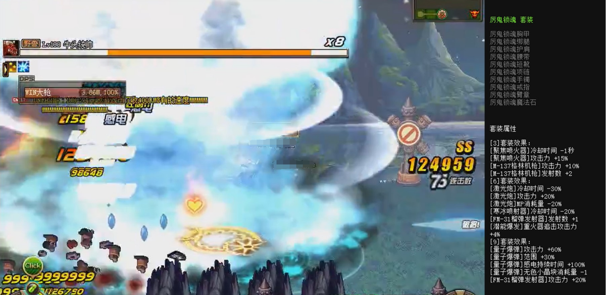 厉鬼锁魂套装加成横扫全图的蓄电激光炮与40级核心输出技能量子爆弹,搭配上激光狂热者,即可成为对男大枪提升最大的一套装备。cd极短的激光炮与半屏幕爆炸的量子爆弹是每个男大枪在异界版本中追求的毕业装备。