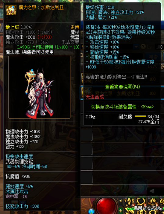 搭配二:魔力之泉:加斯达利亚(武器)+皇家执行者的宣言套装(皮甲套装)+幸运三角套装(首饰套装)+灵宝:世间真理套装(特殊装备左右槽+神话耳环)