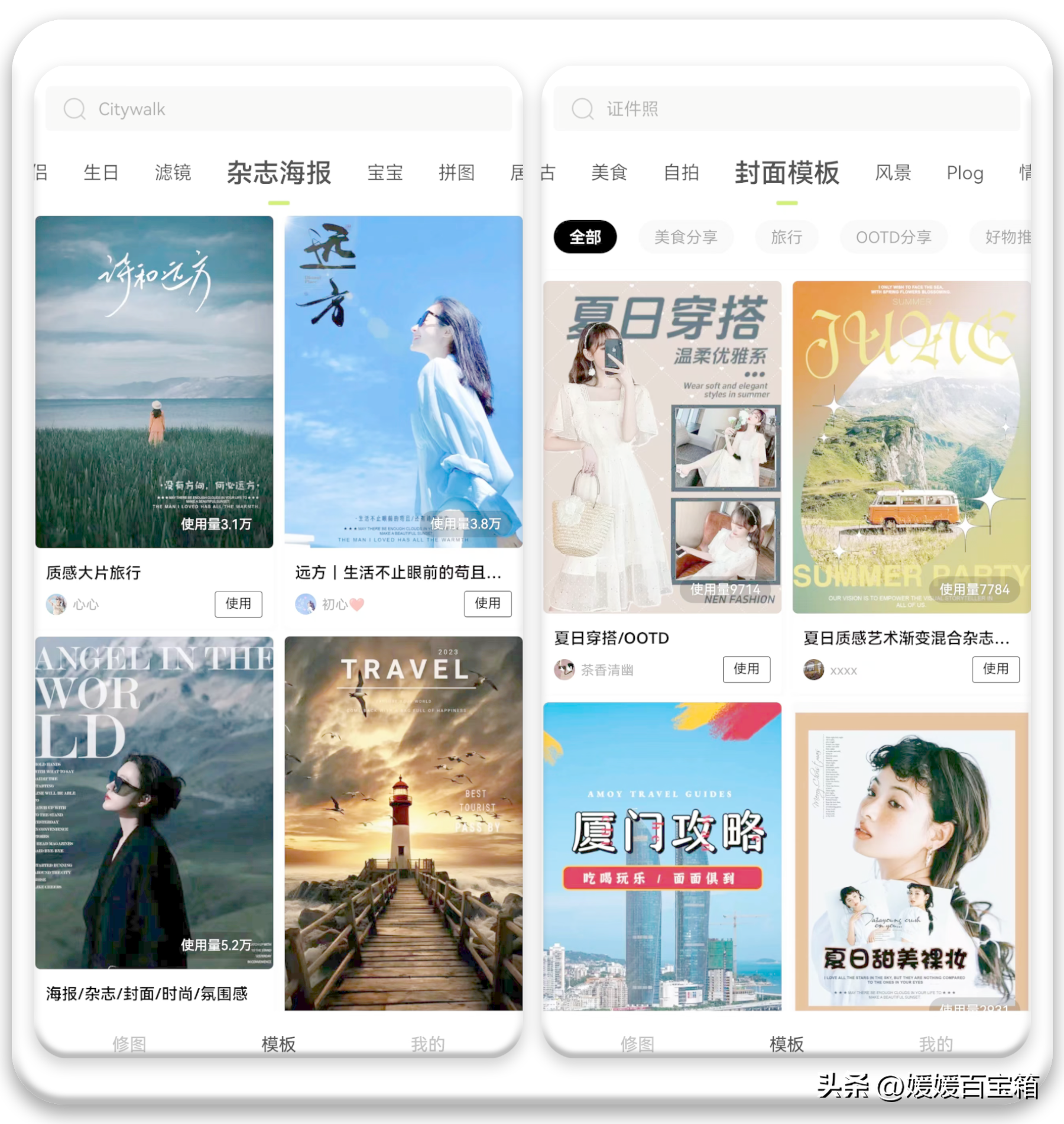 可以用模板一键生成同款主题,有韩国综艺风、可爱、复古、简约、 Plog几个类别,素材十分丰富。