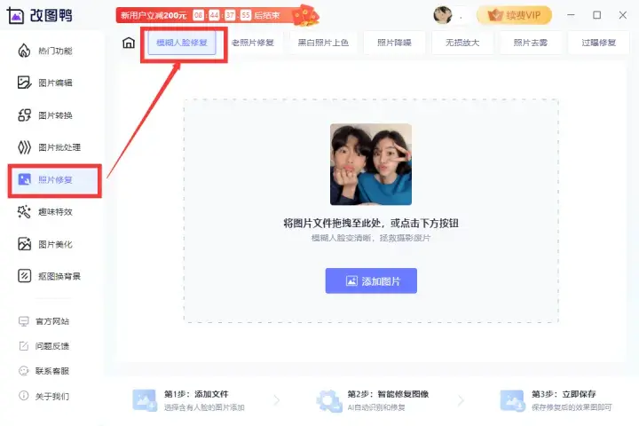 我们打开这个软件,选择照片修复 功能。里面有很多种修复模式,楼主说想修复分辨率比较低的照片,所以我感觉用这个模糊人脸修复 最合适了。
