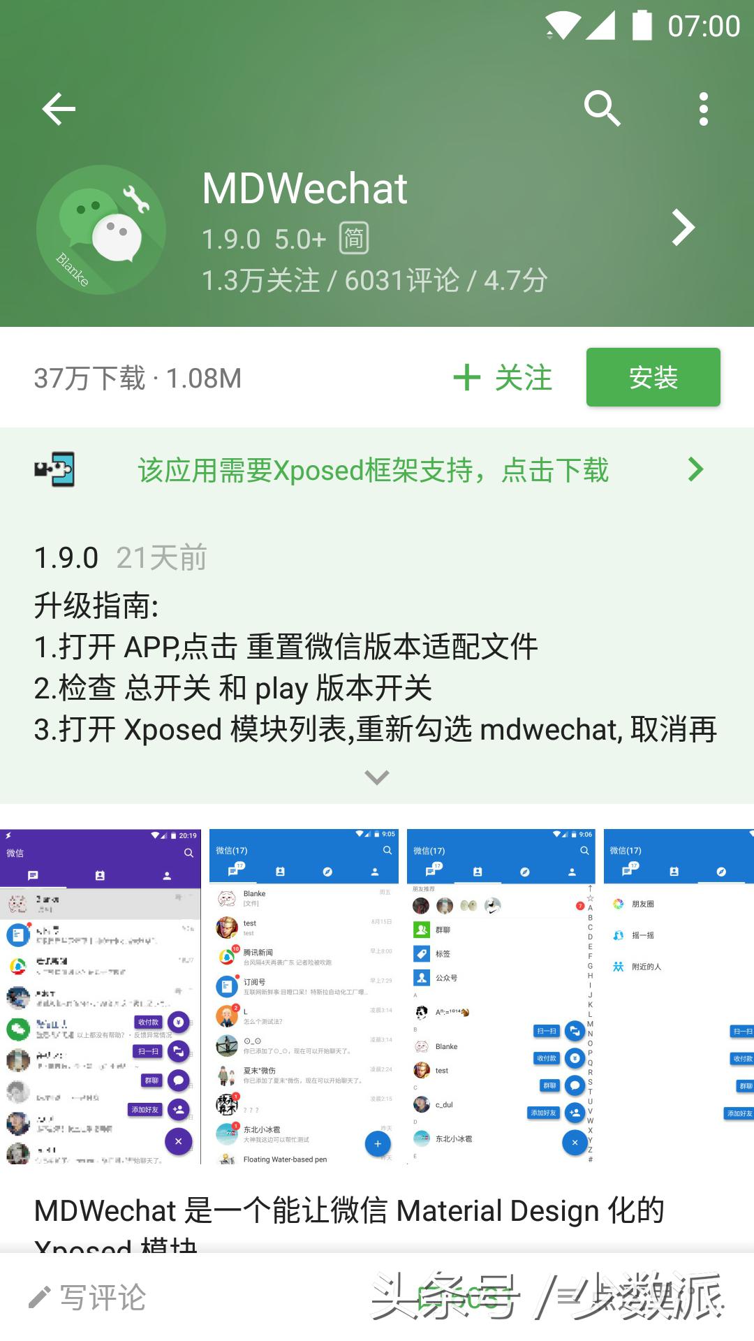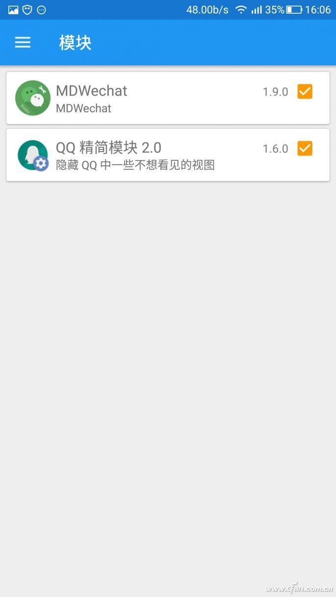 从VirtualXposed官方网站上给出的支持模块列表中,我挑选了两款框架进行测试。其中一款名为MDWechat,是一个能让微信界面 Material Design 化的模块。