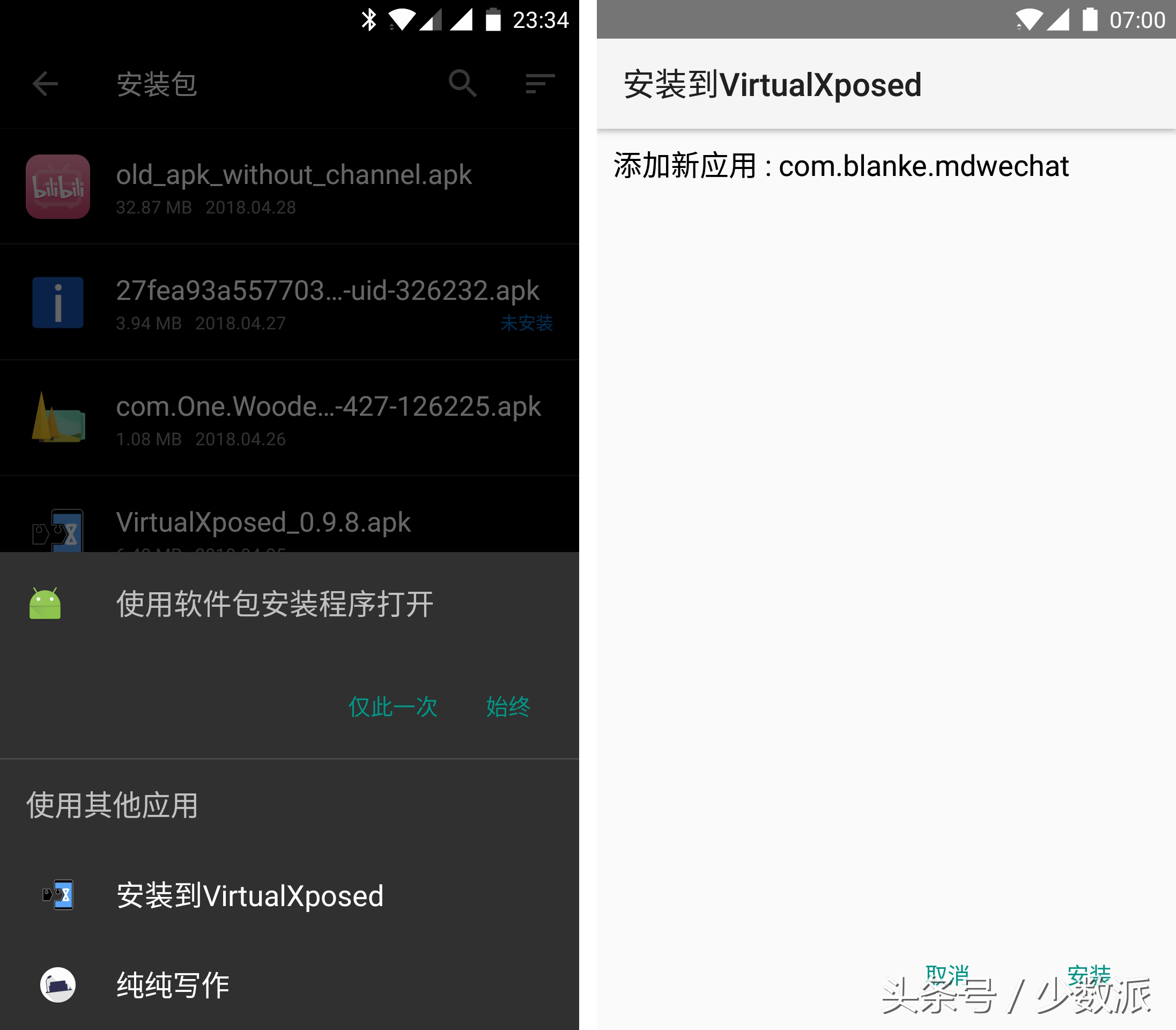 如果想要添加并未安装的应用或模块,可以选择第二种方式;即在各种文件管理器中打开.apk 安装包后,选择「安装到 VirtualXposed」: