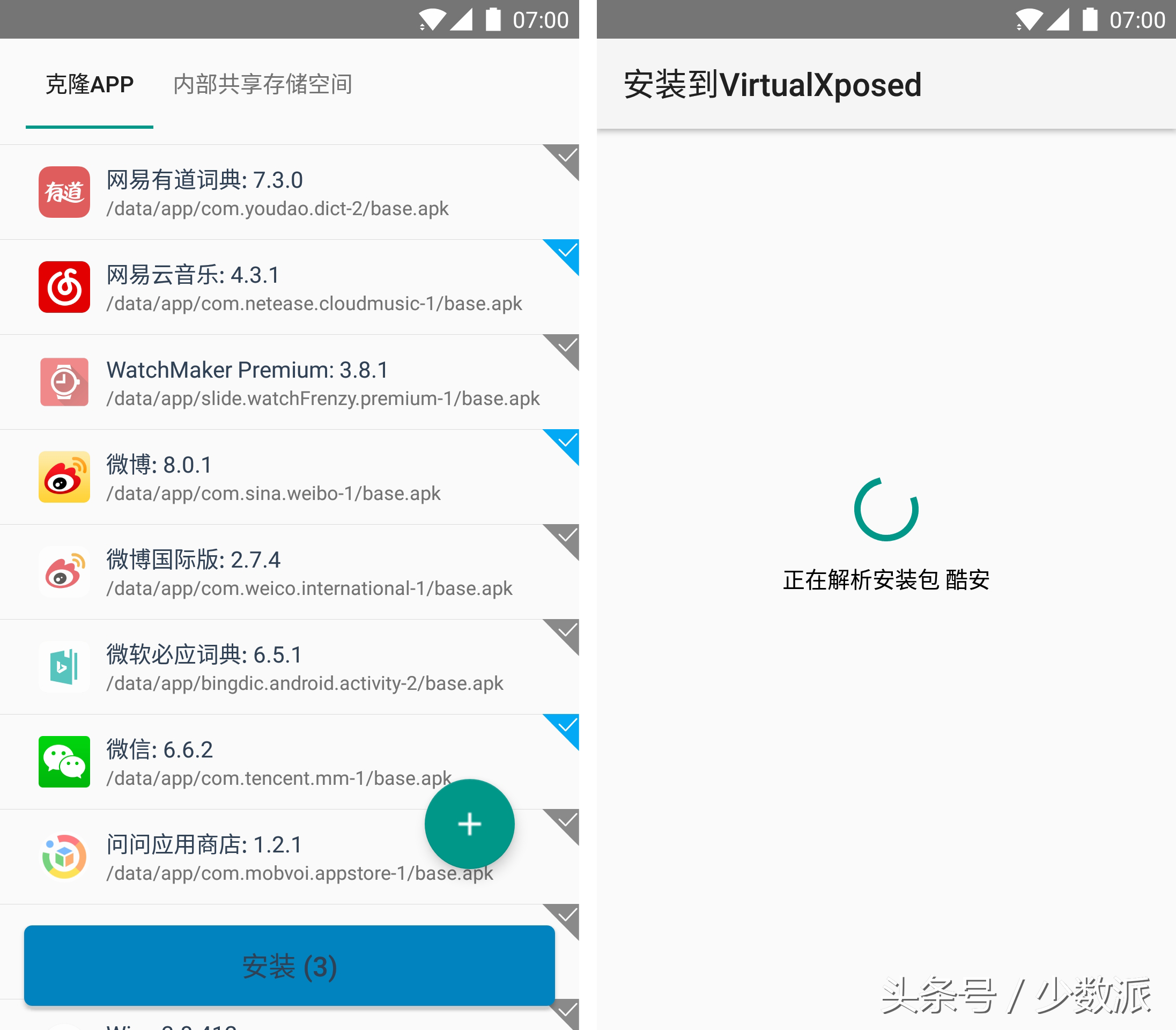 有三种方法可以将应用与模块安装到 VirtualXposed 中。第一种,是「克隆应用」,即将已经安装在系统中的应用添加到 VirtualXposed。