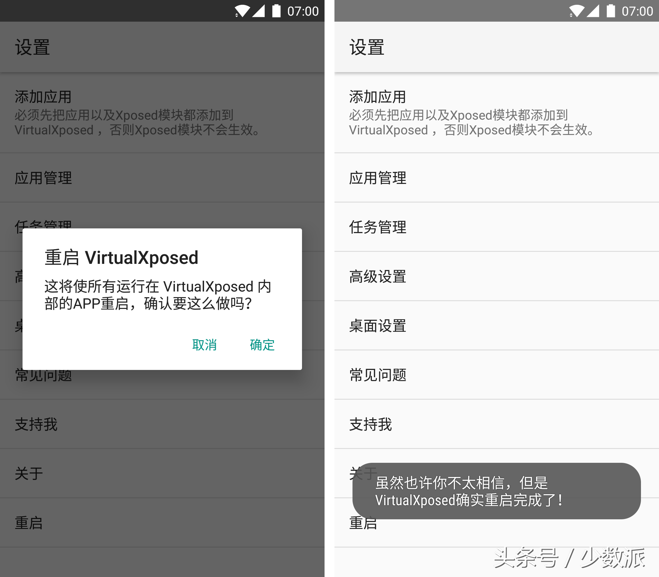 按道理来说,接下来的步骤应该是「勾选模块,然后重启手机」;然而在 VX 中,启用模块并不需要真的重启手机。只要在勾选模块后,前往设置,点击最下方的「重启」即可。「重启」的速度极快,因此作者还设置了一个「温馨」的 Toast 提醒......