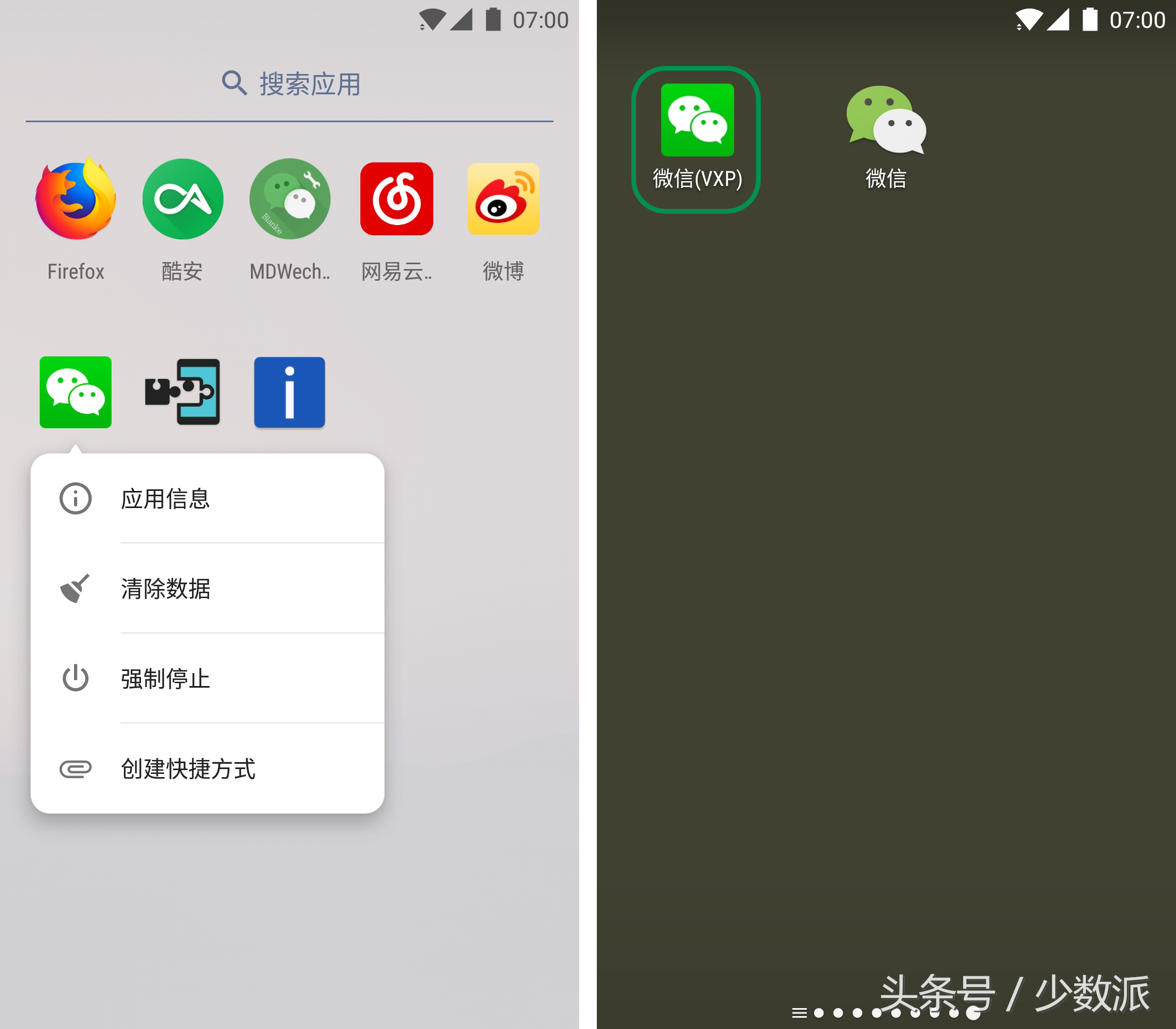 如果嫌每次都要在 VX 的启动器中打开应用麻烦,可以长按图标,选择「创建快捷方式」,这个应用就出现在你的系统桌面上了,应用名会加上(VXP)的后缀。