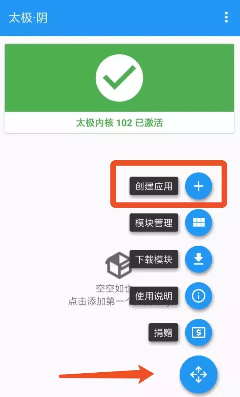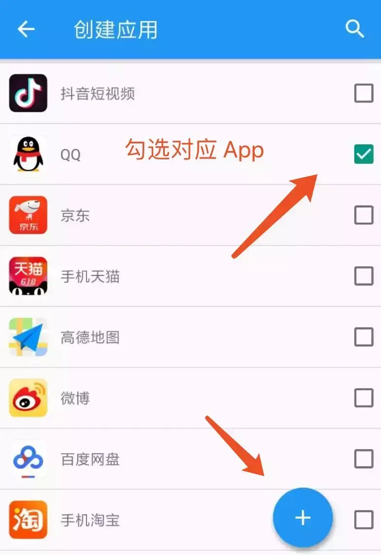 你需要把要用 Xposed 模块的 App,一个个添加到创建应用这里。