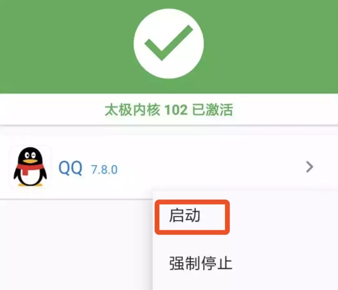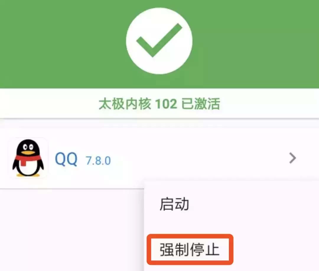 这时候,为了让模块生效,还需要在太极里手动停止应用的运行(如 QX 模块对应生效的 QQ)。