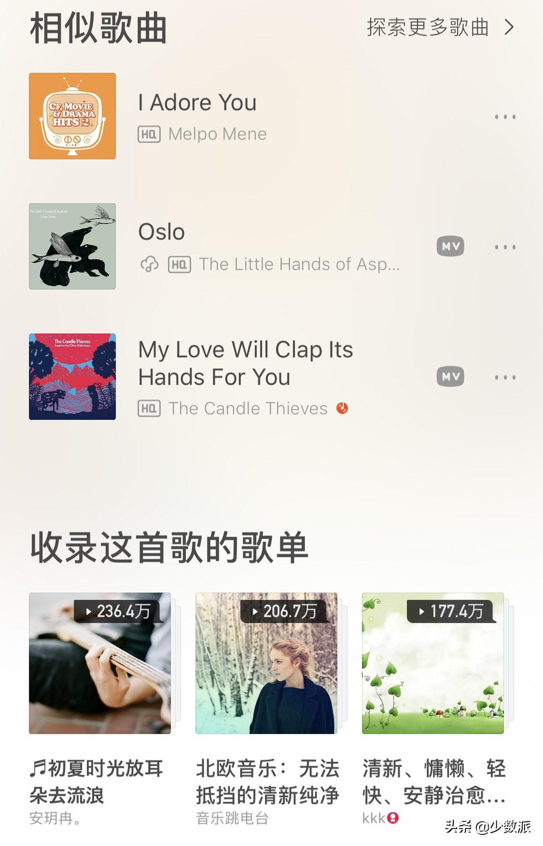 找相似歌曲: 也是开头提到的,当我觉得这个风格我喜欢时,我会继续挖掘其它同类型的音乐人。以虾米为例,在歌曲页面往右滑就能看到「相似歌曲」和「收录这首歌的歌单」。粗听一遍,把喜欢的收藏起来,以后慢慢聆听,或者再次筛选。虾米 App 的相似歌曲页面
