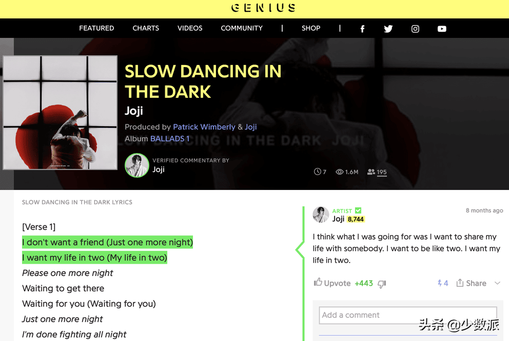 Genius 是一个查询歌词含义的工具型社区,你可以在上面看到某一句歌词的具体解读 ,而不仅仅是乐评人对于某一首歌或者唱片的笼统介绍。里面大部分解读都是乐迷自己提交的,信不信由你,不过偶尔也有有音乐人本尊现身(如下图)。
