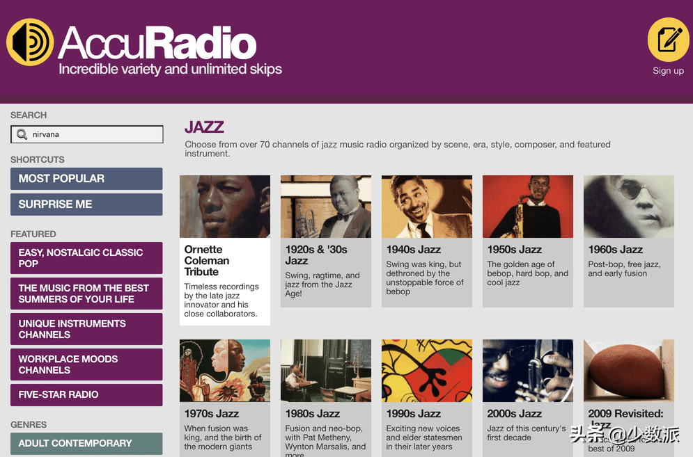 爵士乐我没有很认真地听,只是偶尔会在家里用做背景音乐。如果你喜欢爵士乐,可以试试 AccuRadio 的爵士频道,完全免费不废话,打开就是数之不尽的各种类型的爵士乐循环播 。事实上 AccuRadio 是一个综合型网络电台,很适合平时就比较喜欢听歌单的同学。另一个选择是 JazzRadio,它的分类比较是「巴黎咖啡厅」、「甜美人声」这样的风格,曲库是很庞大的,不过相对而言就比较适合「心情向」听歌或是当作环境音乐。JazzRadio 说是说月费 40 美金,不然会有广告,但听下来好像免费也没什么影响。