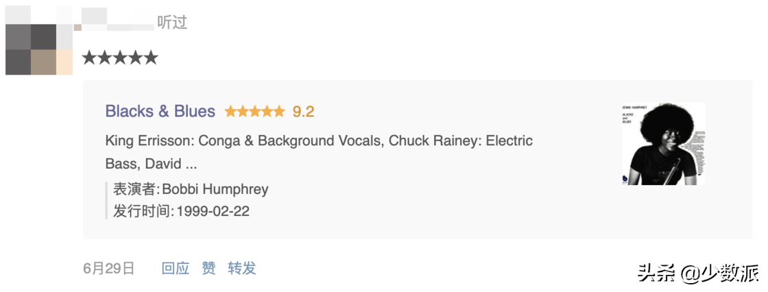 还有人玩豆瓣吗?平时多关注一些音乐审美好的友邻,也会有不错的收获哦。比如下图这个,评分 9.2,友邻给五颗星,再看一看封面,感觉要么是布鲁斯要么是放克,都是我喜欢的,马上「想听」了再说。