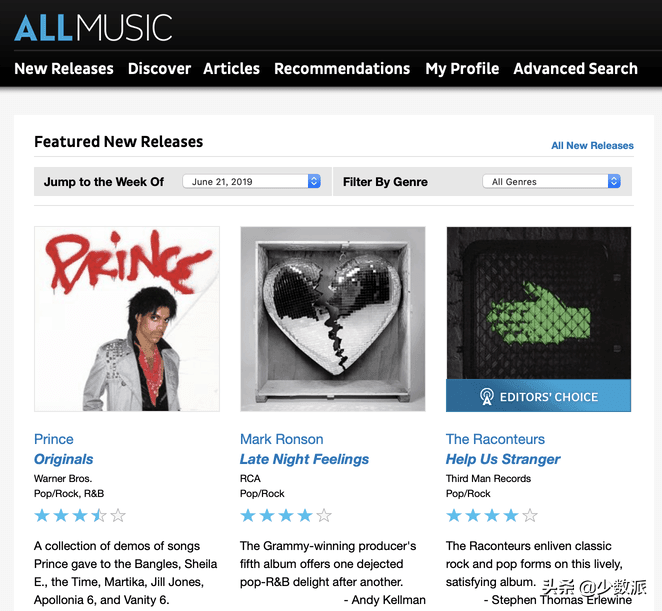 All Music 是一个非常老牌的音乐推荐集评论网站,多年累积下来其内容丰富程度堪称数据库。All Music 的特点是几乎每一张专辑都有很资深的乐评人打分或是撰写评论 ,音乐人的生平介绍也很丰富,听歌之余对于加深理解是一个很不错的选择。虽然都是英文,但闹歌荒的时候,一张符合自己审美的唱片封面以及不错的评星往往会给人带来意想不到的惊喜。