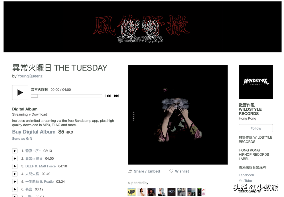 Bandcamp 大概是全球最知名的独立音乐平台。任何音乐人均可在上面发布和销售自己的音乐,用户可以完全免费试听,也可以付费下载或者购买实体周边 。截至 2018 年 5 月,Bandcamp 上音乐人的创收总共达到了 2.96 亿美元。我最喜欢在上面买数字专辑,因为它的无损音乐文件均为音乐人提供,绝对货真价实 。而且很多都价廉物美,比如下图这张我近年最喜欢的说唱专辑,竟然只售 5 块钱港币!