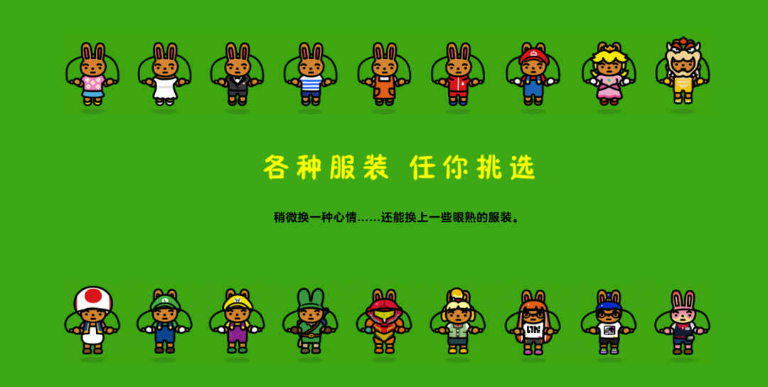 除了默认的小兔子造型外,还可以穿上各种任天堂角色的服装~看着一个个熟悉的角色跳绳还真是别有一番趣味~