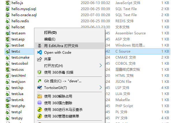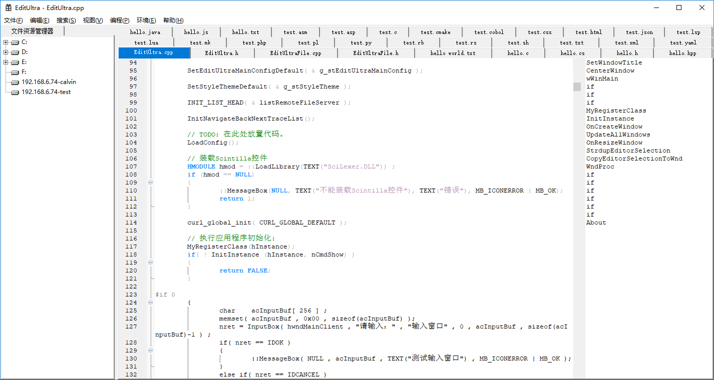 多文件选项卡WINDOWS资源管理器右键菜单打开文件/目录中所有文件检测文件变动实时重载文件打开期间自动设置为只读文件换行符和字符编码转换远程文件直接打开和保存高级的切剪、复制和粘贴高级的移动、累积选择BASE64编解码、散列摘要计算和加解密书签导航白字符显示编程语言语法高亮、自动完成和方法浮动提示,语句块折叠展开连接Oracle/MySQL,获取全表字段列表,执行SQL,显示查询结果到表格连接Redis,执行命令,显示查询结果到树配置执行对文件、选择文本的命令EditUltra完全使用C用纯WIN32API编写而成 (v1.0.0.3大约有近2万行代码),又加入了众多优化算法和数据结构,提供了极高的运行效率和较低的系统资源占用,秒开文件,键入时毫秒级弹出自动完成列表。