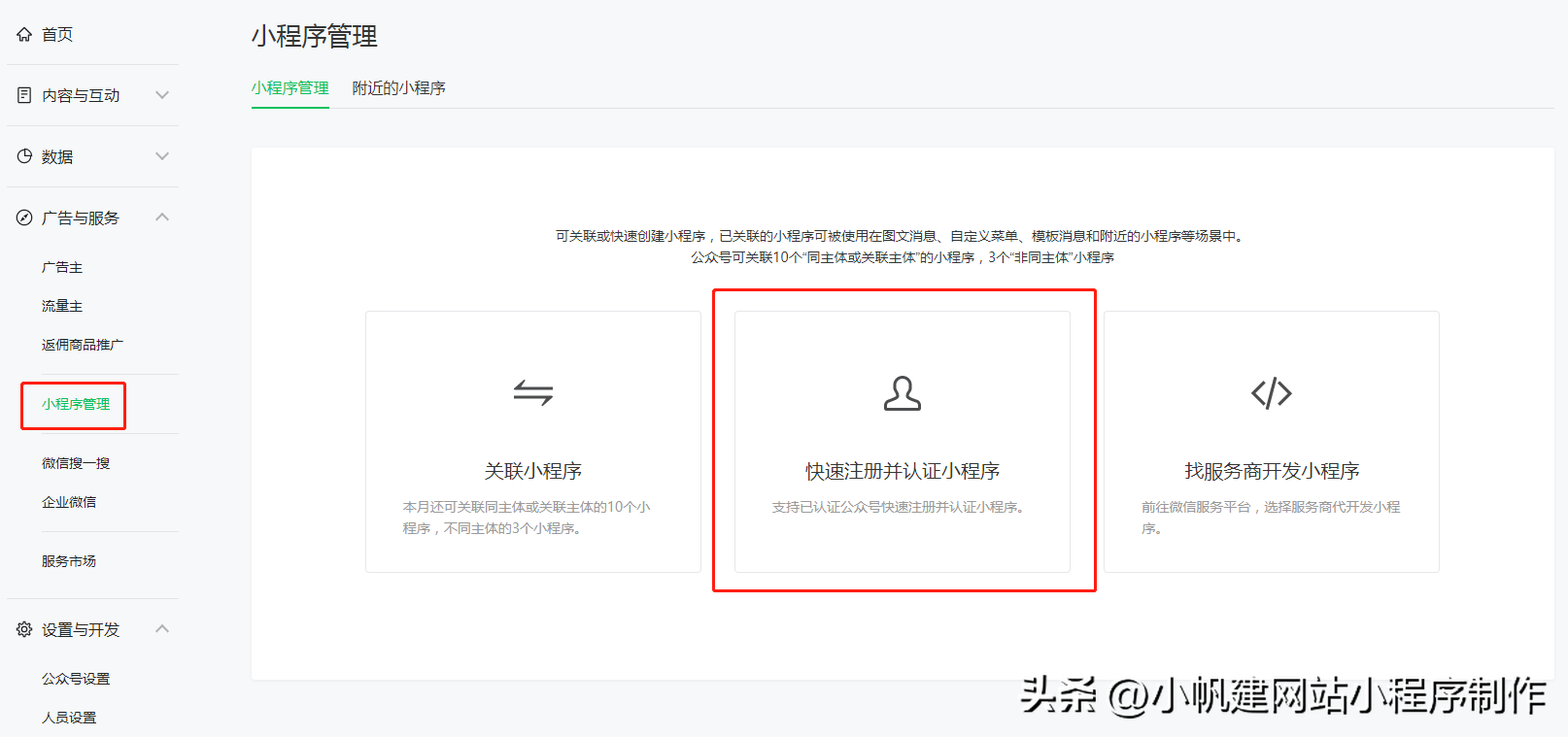 微信商城一般是小程序的形式,而且微信商城小程序使用起来也方便,维护也比较简单。那首先我们要在微信公众平台注册一个小程序账号,不过很多企业商家都会有自己的公众号了,更方便快捷的方法是在公众号后台的小程序管理选项中快速注册小程序账号,就可以直接复用公众号的资质来注册小程序账号了。