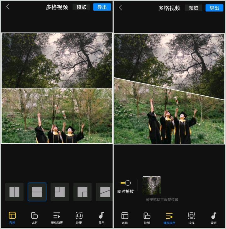 非常值得一提的是,像那种在各大平台经常看到的上下分屏、左右分屏的视频它也可以制作,里面配置多种分屏模板,还可以设置边框、音乐、播放顺序,还可以预览到分屏播放的效果。