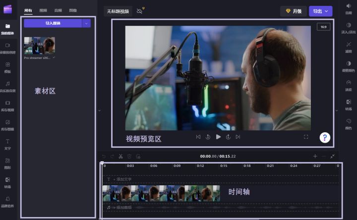 在线软件,比较便携,操作简单,需要登录账号使用,视频编辑器,电脑摄像头录像,屏幕录像,视频模板,时间线编辑器,视频转场,视频叠加(部分功能收费)