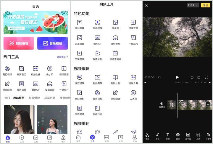 功能强大丰富,“傻瓜式”操作难度,支持视频剪辑、配音、字幕、倒放、变速、分屏、特效