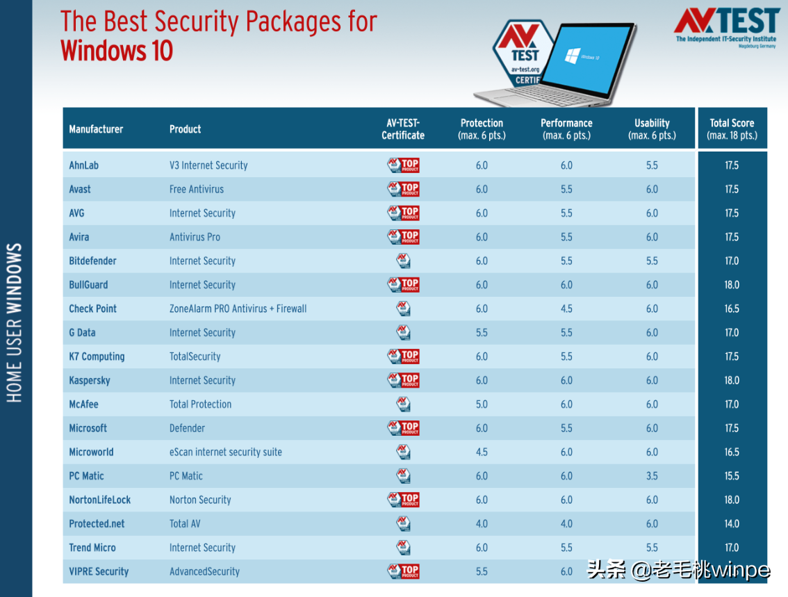 不知大家有没有发现,除了这三款拿到满分的杀软夺得头魁,防病毒软件Windows Defender却成功引起了老毛桃的注意,Windows Defender与满分仅差0.5分!而在数亿之多的win10电脑用户中,几乎所有的用户都安装了第三方的杀毒软件。当然,也有很多对计算机比较了解的win10用户更偏向于“裸奔”。