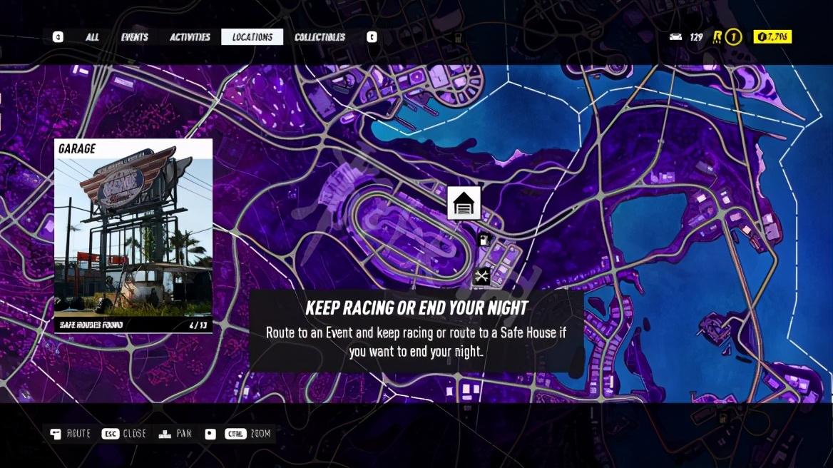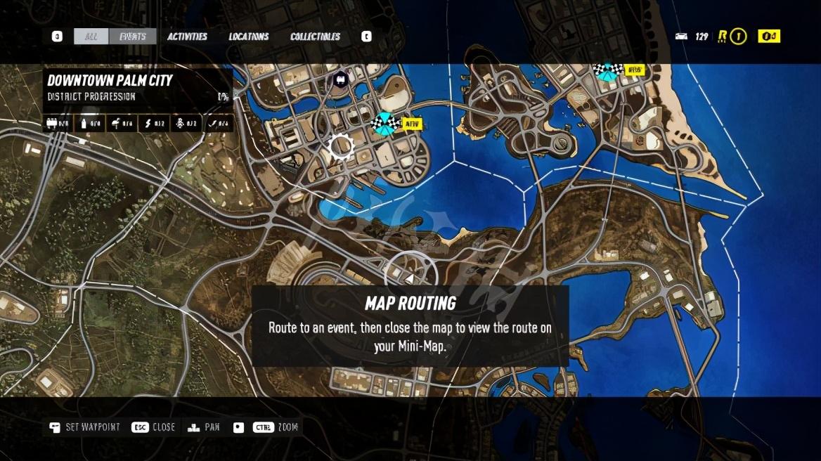游戏中按M可以打开大地图,地图中的地点按赛事、活动、地点、收藏偏品进行分类。对准目标按回车会显示车辆移动路径接着回到车辆界面即可进行导航,同时导航路线也会在迷你地图中显示。和前作一样游戏会在赛事图标上标注比赛的类型以及推荐的车型。