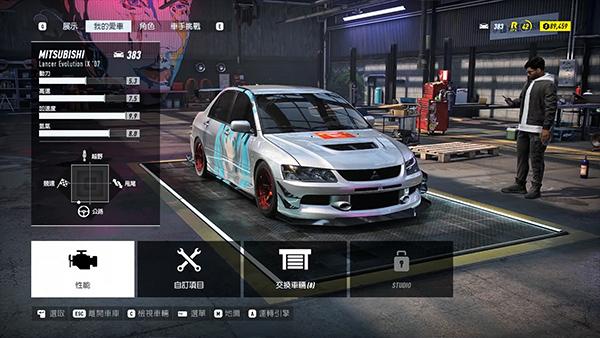 车辆改装本作玩家可以随时随地地使用tab切除车辆改装界面而不用前往指定的车库进行更改。车辆的性能能在右侧的表单中直接看到,同时车辆目前性能适合的赛事类型也会在表单下方的定位表中显示。基本更改分类为车辆外观以及车辆性能。车辆外观包括了车辆的烤漆和贴花的设置、烧胎的烟雾效果以及引擎的轰鸣声调节。车辆性能包括了引擎、底盘、传动、辅助四大分类,这分类之下囊括了传动轴、ECU、冷却、排气管、涡轮增压、氮气、悬挂、刹车、车胎、差速器、变速器、离合器的更改。玩家可以选择更换整体大分类也可以选择更改单个小零件。传动轴-强化引擎的输出效率,能够提升加速性能。ECU-引擎的点火设备,这里用来提升起步性能。冷却-引擎的冷却设备,用以提升引擎的工作效率,影响加速和极速。排气管-排气在游戏中并不会影响车辆的性能,但是会影响车辆的排气音效,玩家可以随意调整参数来选择自己最喜欢的轰鸣声。涡轮增压-车辆的进气系统,影响加速。