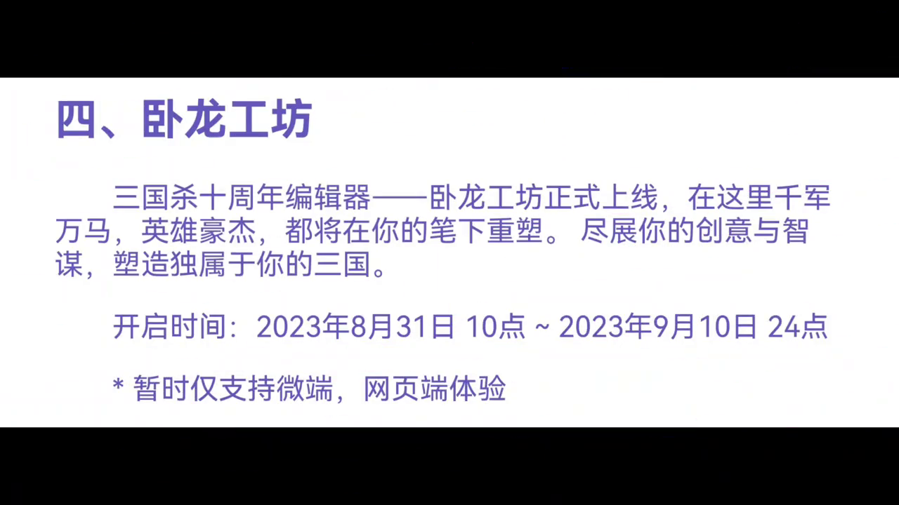 尊敬的玩家朋友:《三国杀十周年》将于2023年08月31日4:00-9:00进行维护,以避免不必要的损失。如有不便之处,敬请谅解!如遇特殊情况,开服时间将顺延。维护结束后,玩家可前往游戏内的系统更新:1、新界限突破武将。2、武将调整。3、身份武将转欢乐。4、新模式——卧龙工坊。5、超级地国杀式调周年8月版本更新内容:5、超级地国杀式更新内容相当丰富,包括超级手里盘了两年的天牢突破、超级标天填强为界天牢的武将调整。三个二二新天牢、一个diy新模式、一个逼克调整和几个酱绩效的优化。