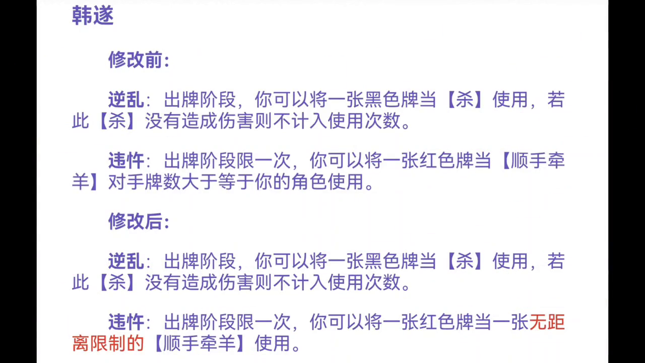 逆乱:出牌阶段,你可以将一张黑色牌当【杀】使用,若此【杀】没有造成伤害则不计入使用次数。违忤:出牌阶段限一次,你可以将一张红色牌当【顺手牵羊】对手牌数大于等于你的角色使用。左慈、灵雎、步骘加入欢乐成双将池。步骘是杂耍将始祖,有一定的开发空间,左慈和邻居则是天牢。