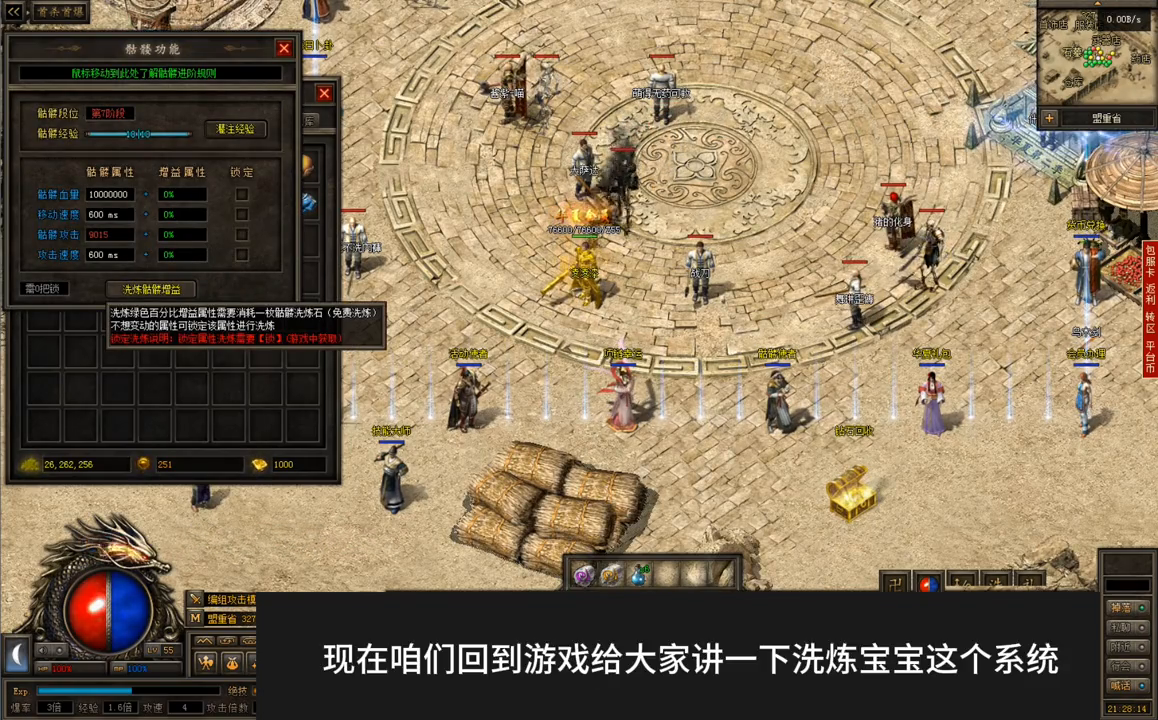 接下来,介绍洗炼宝宝系统。宝宝有四个属性,分别是血量、移速、攻速和攻击力。洗炼宝宝只需要材料洗炼石,而且爆率很高。现在消耗一个石头,四个属性的数值会随机变化。如果其中一条属性的数值很高,可以锁起来。再洗就是没锁的三条属性会变,这条锁起来的属性数值就不会变化。