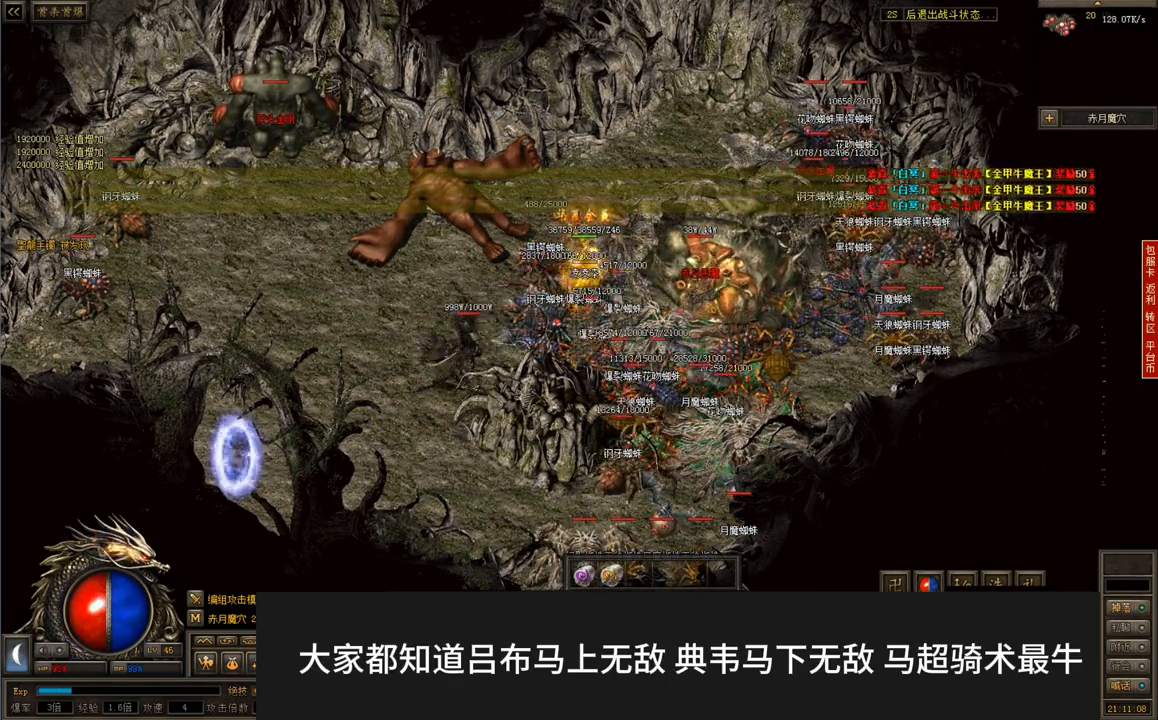 接下来,简单介绍一下练级路线。建议先去矿区,升到二十级后直接去祖玛,祖玛升到四十级去赤月。前四十级基本上是打一个怪升一级。画面中的赤月恶魔就像砧板上的鲶鱼一样,我只是随便丢了几个地钉,这些怪物就消失了。
