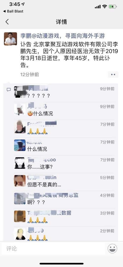 今天下午,掌聚互动CEO李鹏的个人微信朋友圈意外发布了一条讣告,讣告中称“李鹏因个人原因经医治无效于2019年3月18日逝世,享年45岁。”
