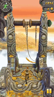 说到《水果忍者》,就不得不提到同期一样红火的《神庙逃亡》。《神庙逃亡》于2011年8月在App Store上发布,玩家扮演一位到古庙寻宝的冒险家,获得禁忌的秘宝后,会有一只黑乎乎的怪物向你袭来。玩家需要在被它抓住前,奋力逃亡。在没有终点的逃亡路线中,设有各种各样的致命机关。