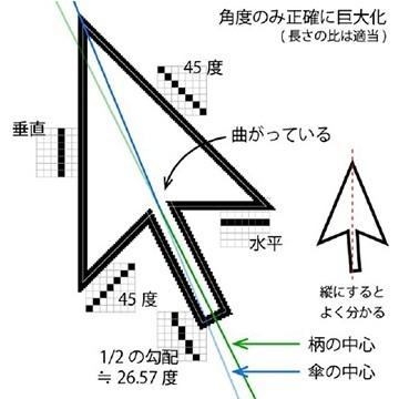 此外还有一个美观的原因。如果把指针的柄设计成中心对称,那么柄的倾斜度就是22.5度,而22.5度的tan值是0.41左右,意味着画柄的时候,每横移1个像素就要往下画2-3个像素不等。早期的鼠标图标是不带反锯齿的,仅仅是单色图标,这样画的话柄的边缘会参差不齐,很难看。而设计成26.57度的话,tan值刚好是0.5,画柄时每横移1个像素就固定往下画2个像素就可以了,边缘会比较好看。
