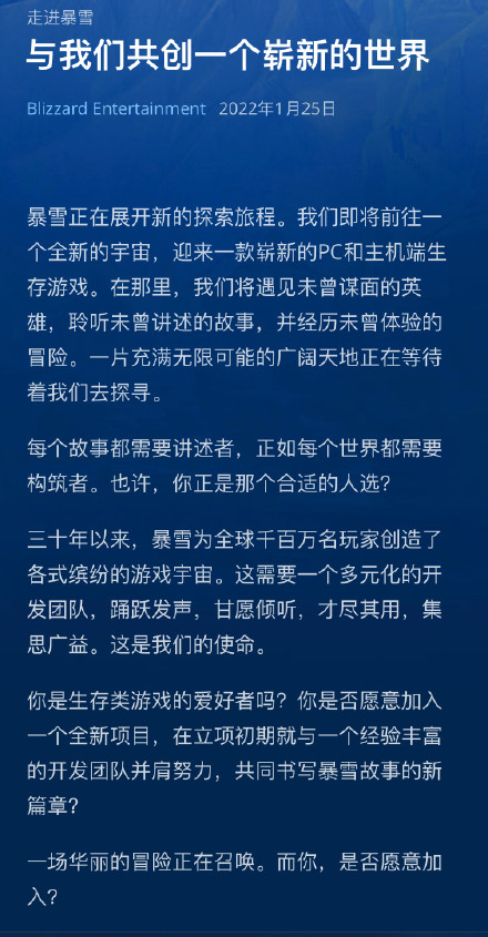 暴雪在26号凌晨宣布,他们正在开发一款PC和主机端的3A级生存游戏新IP。虽然游戏进度还未可知,但据各种公开消息了解,这个项目已经启动了四年半的时间(从2017年月开始),并且由一系列暴雪老兵和牛人组成,目前也还在招募开发人员。