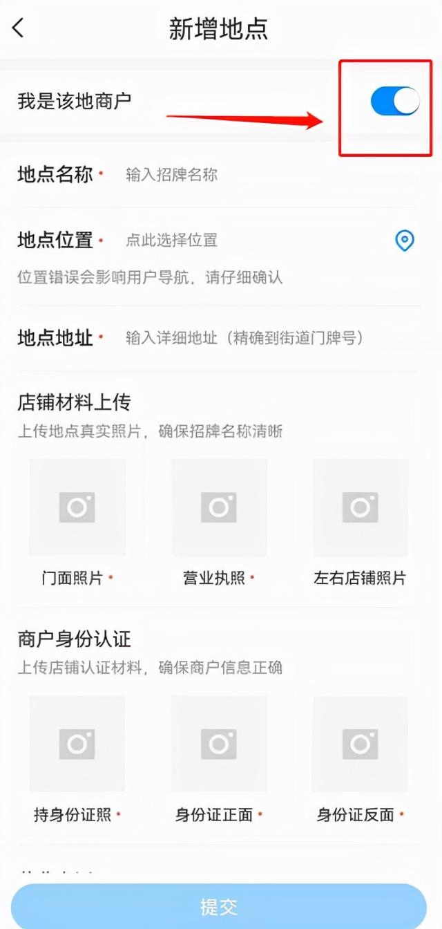 5、进入后先将我是该地商户右侧按钮开启,然后根据下方要求填写内容