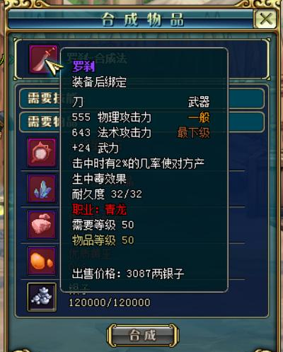 拿到图纸和其他的材料,就可以进入打造装备的第二步“合成”。进入《名将三国》合成界面后,可以看到即将合成的装备属性,这个时候一定要看清楚合成后装备的等级、职业、属性等信息,意外制作成一个自己使用不了的装备就尴尬啦!