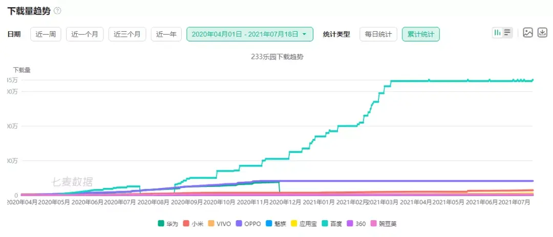 持续长时间的高量投放为《233乐园》换来了大量的下载量,其安卓平台累计总下载量超过7.9亿次,其中百度获量最高,峰值达到一天67万次。