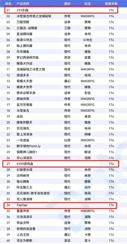 到了2021年,《233乐园》买量依然不减。2021年按产品持续投放天数排名TOP100中排名第一,同天数的还有4399游戏盒和TapTap。