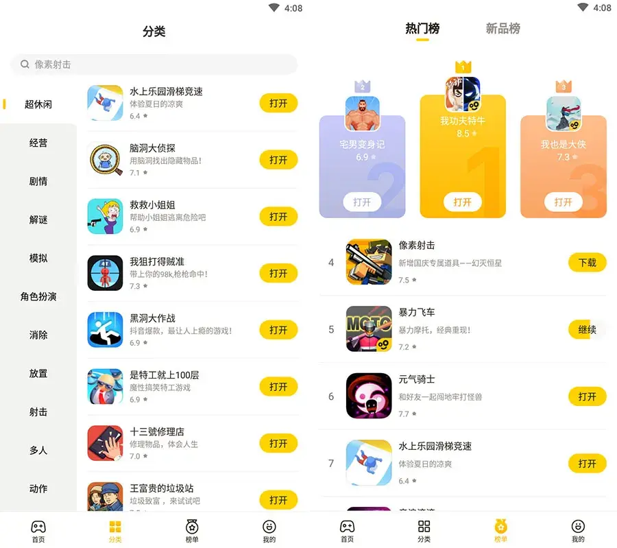 顾名思义,摸摸鱼目标人群为工作学习偷闲的玩家,以休闲游戏为主,覆盖的是用户的碎片时间,平台内整体明亮的黄色主色调也暗示了其出身:字节跳动旗下休闲游戏品牌Ohayoo。