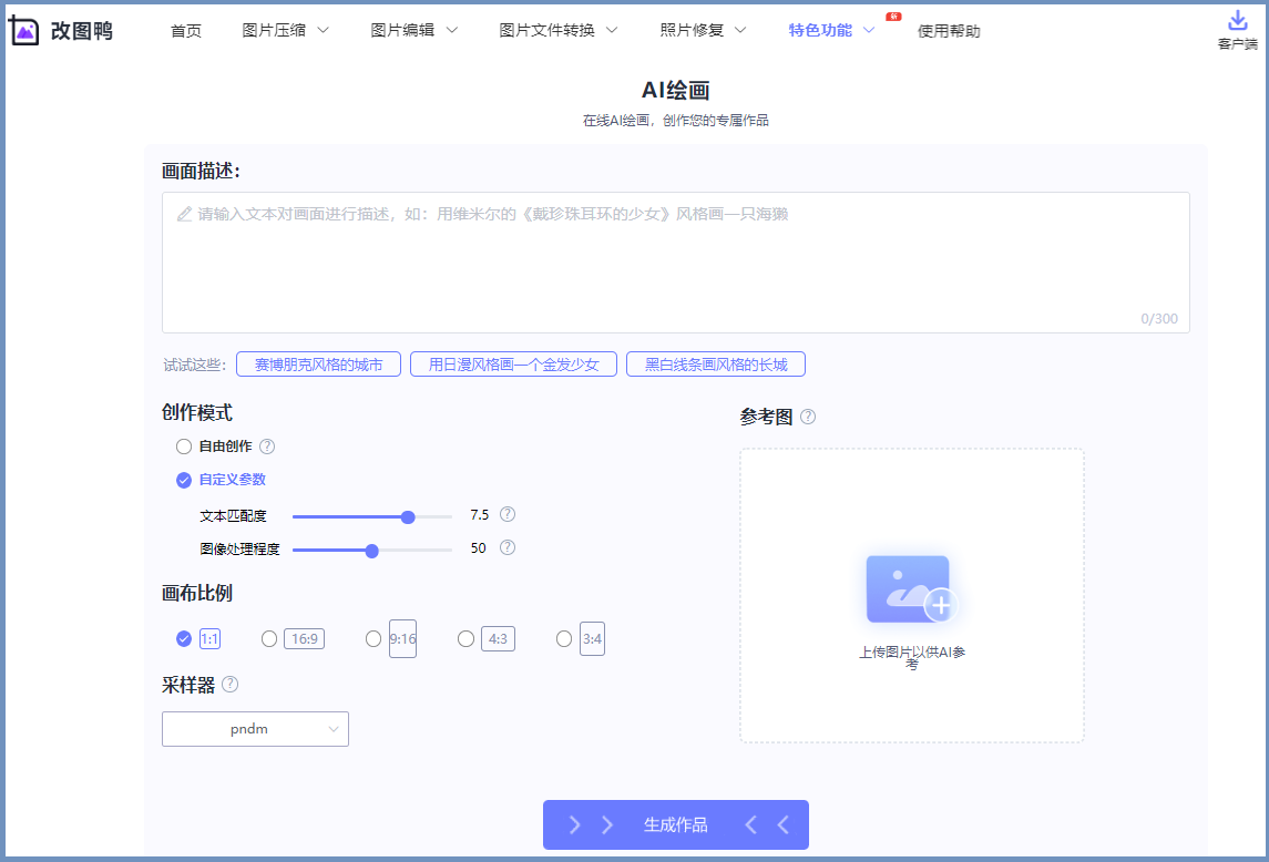 输入画面描述关键词选择创作模式、画面比例、采样器 等点击【生成作品】即可快速生成画作。(可以选择性上传参考图)