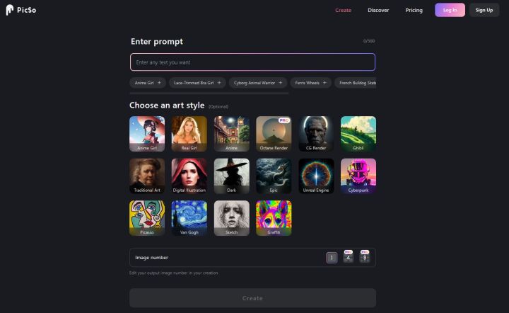 创作方式,打开之后点击【Start Creating】即可进行创作,输入关键词、选择风格、数量 点击【create】进行创作。由于软件页面显示为英文,所以输入关键词也需要用英文输入哦!