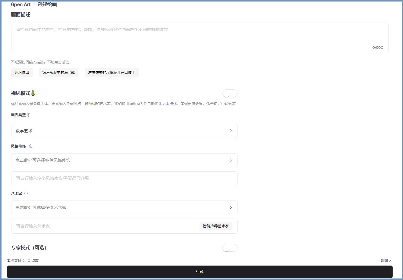 创作方式也是首先描述需要绘制的画面 ,选择画面类型、风格修饰、专家模式 (部分扣除点数较多,非免费)、选择尺寸、选择通道。