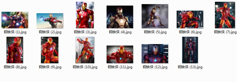 首先声明,训练模型尽量不要用真人或明星的照片,以免造成不必要的麻烦。这次我们以训练钢铁侠为例,直接在某度上搜索钢铁侠的图片,尽量选择同一种风格的,比如钢铁侠有好多版本和型号,尽量选择同一个版本和型号的图片,另外就是图片数量最少10张,尺寸尽量保持一致。我这里为了节约时间,随便搜了一些钢铁侠的图片,也没太注意版本和尺寸。