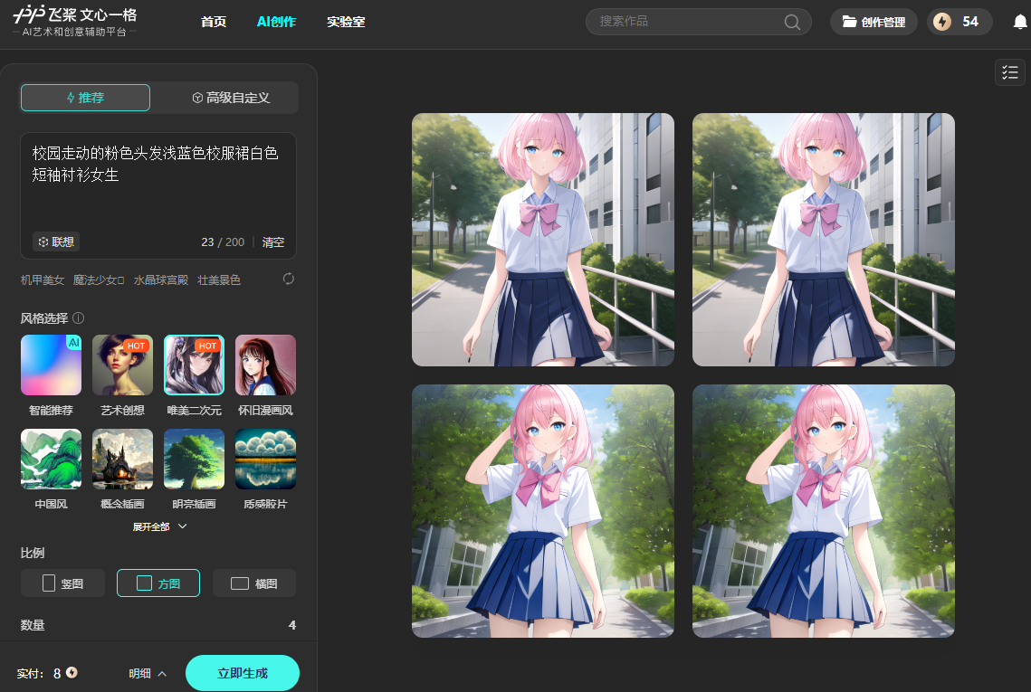 同样是输入关键词 (越详细越能创作出符合你想法的作品)选择风格、比例、数量 进行创作(创作速度是真心慢!但好在效果还不错)。
