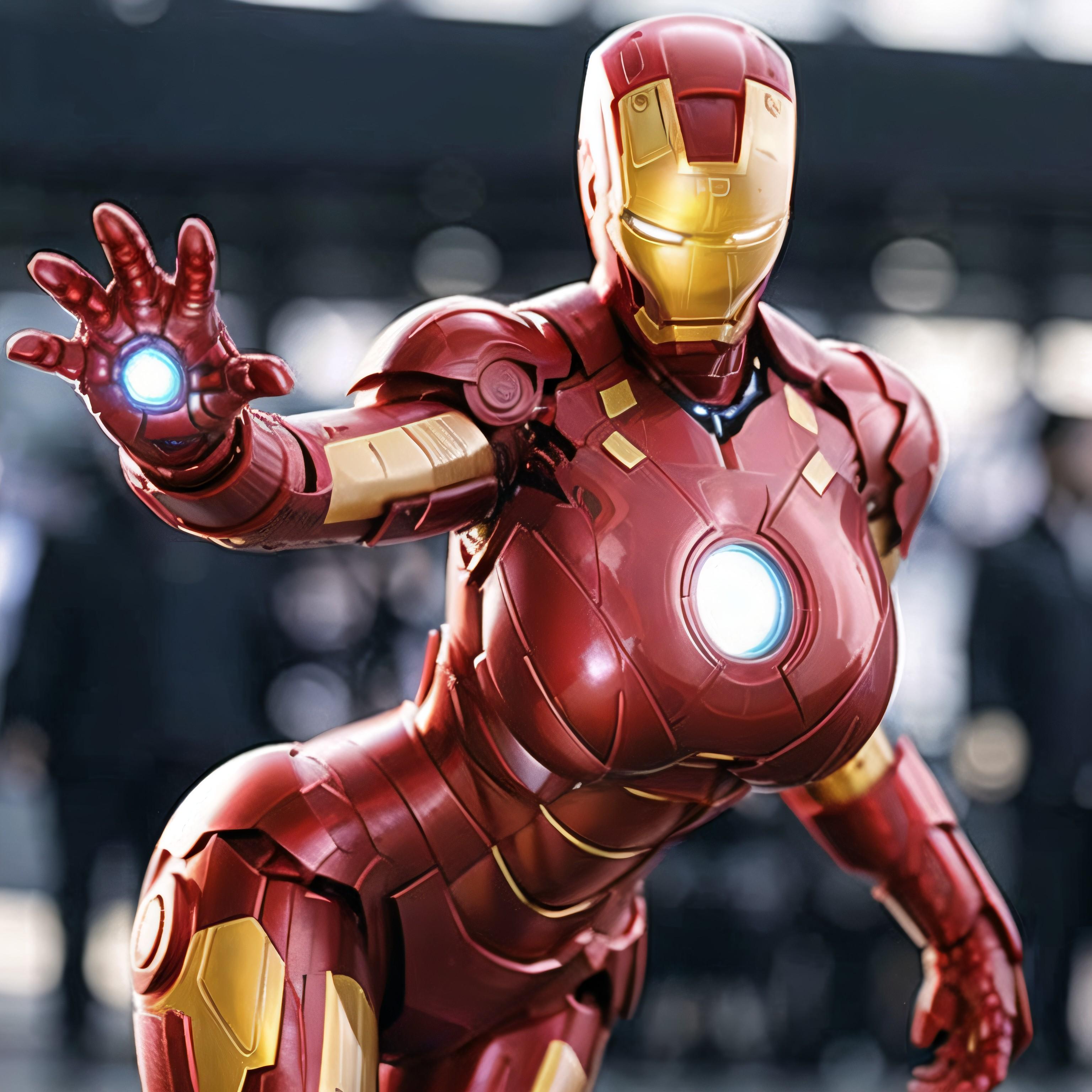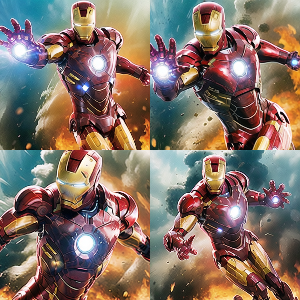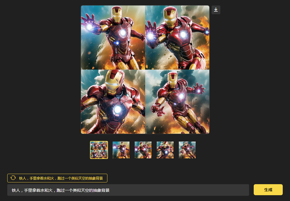 选择我们自己训练的钢铁侠模型后,提示词上方自动出现参考提示词:铁人,手里拿着水和火,跑过一个类似天空的抽象背景。我们本着拿来主义的原则,就用它生成第一幅钢铁侠图片(见下图),感觉还不错。