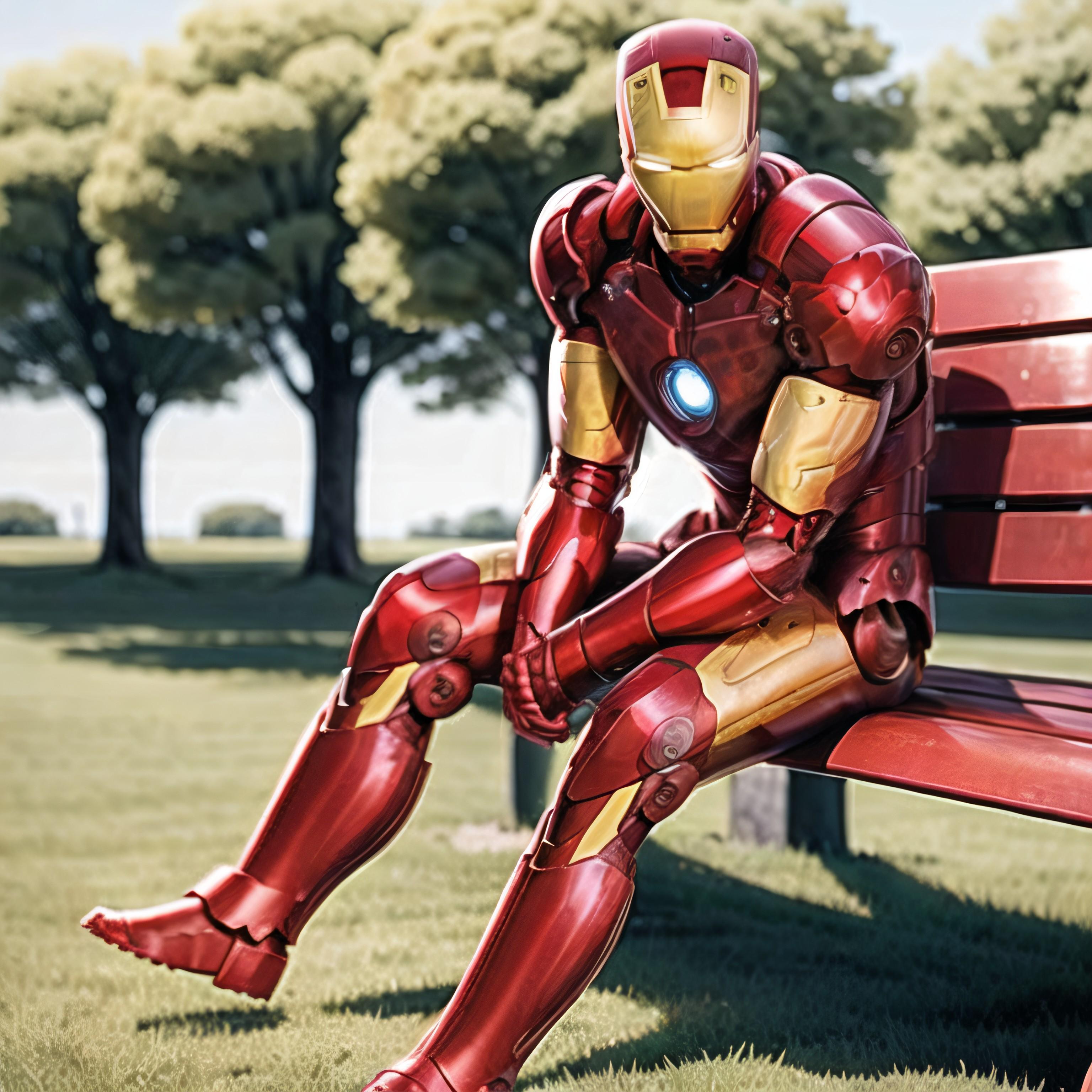 接着我们换个提示词:钢铁侠坐在公园长椅上面,背景是草坪和树。