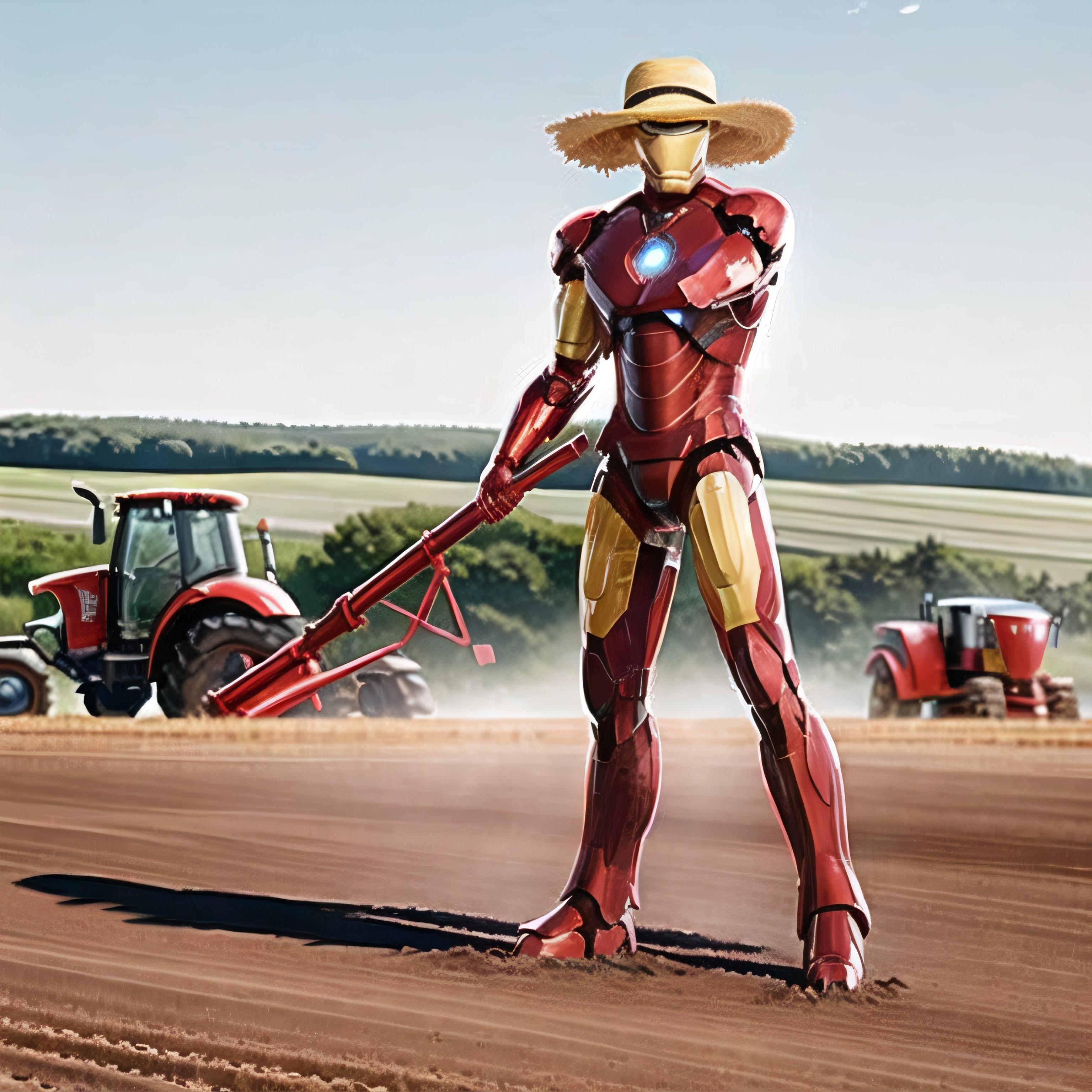 再让脑洞开得更大一些,我们再换上新的提示词:钢铁侠戴着草帽,在农村的田地里干农活,用锄头锄着地,背景是一台拖拉机。